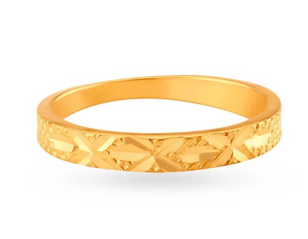 This shimmering 22 Karat gold ring has a running lattice textured pattern across the band and groups of intersecting leaf motifs for a superb contrast